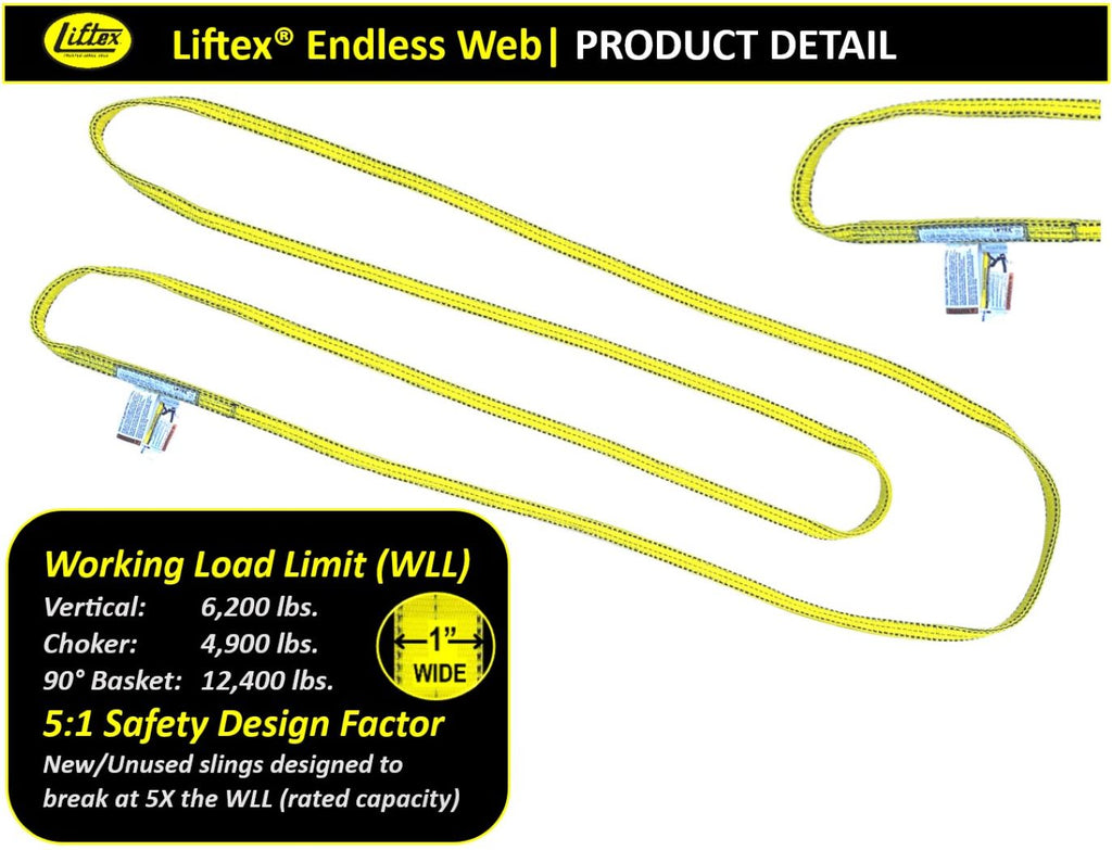 Elevate your lifting with Liftex® Pro-Edge® Endless Lifting Sling. Unlike most slings, Pro-Edge® offers structural protection that stays flexible and won't wear off. Enjoy premium American toughness at a standard webbing price. Unlike eye & eye web slings, the Endless "EN" web sling design allows for rotation of bearing points, avoiding one constant bearing point and thereby increasing useful life.